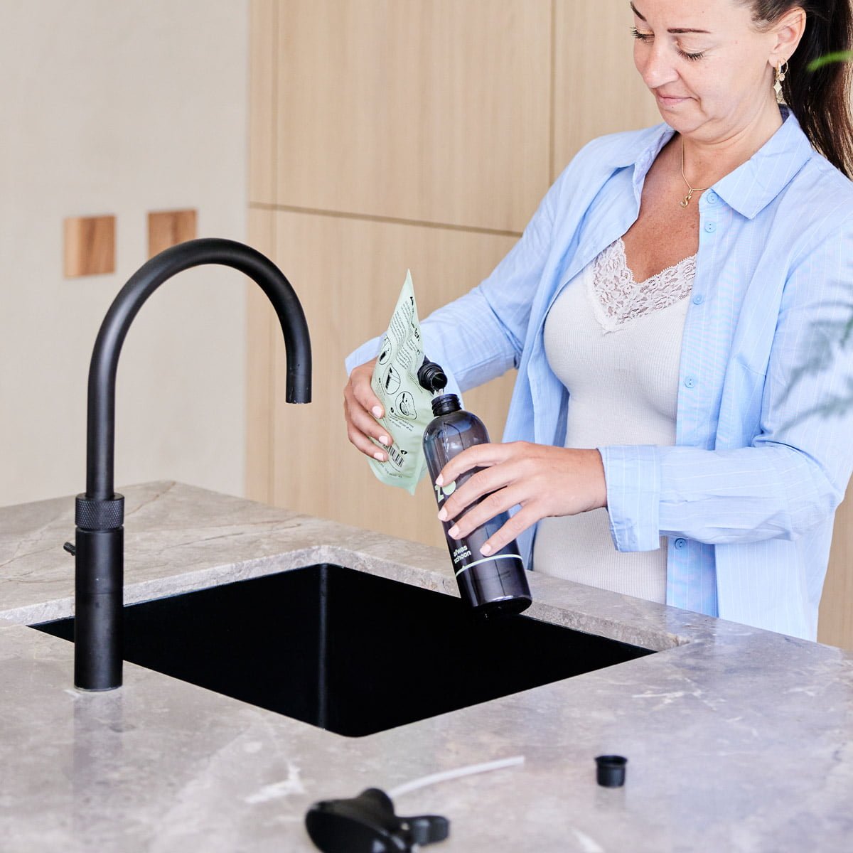 Je vult je sprayer en schuimer tot de streep met reiniger of zeep uit de navulzak. De rest vul je aan met water uit je eigen kraan. Bijvullen is dus heel eenvoudig. Eén navulzak met reinigers vult 10 sproeiers. Met een navulzak ZOVEEL schone handen en ZOVEEL schone vaat kun je 5 schuimers vullen.