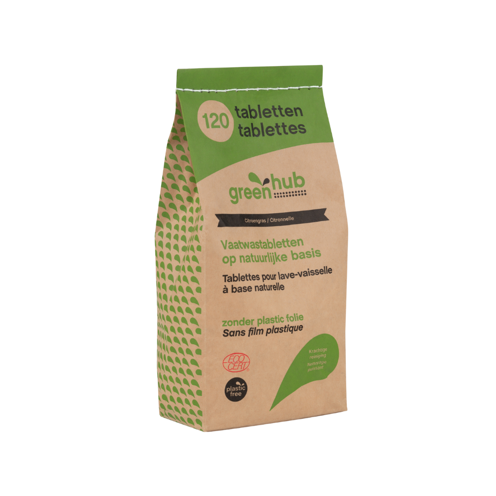Inhoud: 1x Greenhub Vaatwastabletten – Plasticvrij – 120 stuks