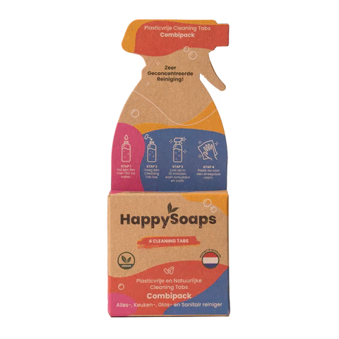 Stop met het betalen voor 80% kraanwater en het rondslepen van zware plastic flessen. Dit is de allereerste 100% plasticvrije schoonmaaklijn van Europa: HappySoaps Cleaning Tabs. Met slechts een Tab en wat water tover jij iedere plastic (spray)fles om in 750 ml aan supereffectief en geconcentreerd schoonmaakmiddel. 100% plasticvrij, vegan, natuurlijk en vrij van palmolie. Ontdek de toekomst van schoonmaken!
