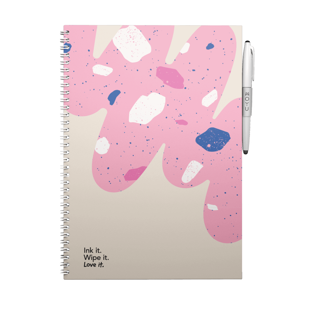 A flamingo pink, desert sand-inspired cover with a smooth writing experience on water & tear resistant pages made from 100% recyclable stone paper.