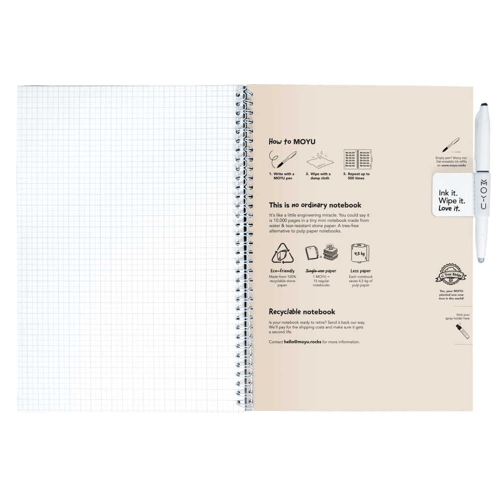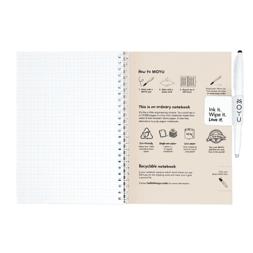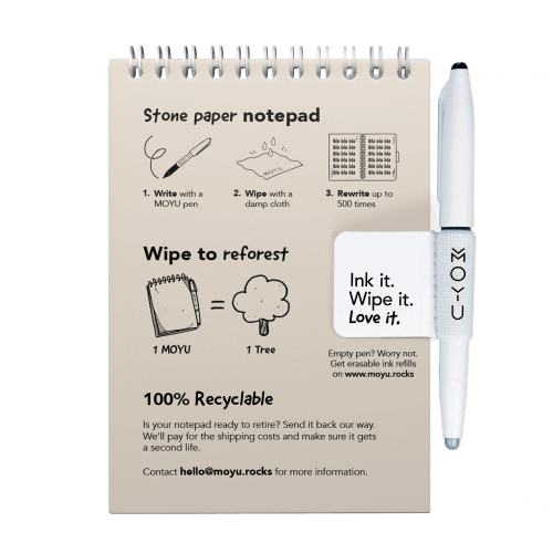 Ervaar uitwisbaar steenpapier met de Flamingo Desert notitieboek van MOYU. Schrijf op water- en scheurbestendige pagina’s van 100% recyclebaar steenpapier. Je kan de pagina’s tot 500x hergebruiken!