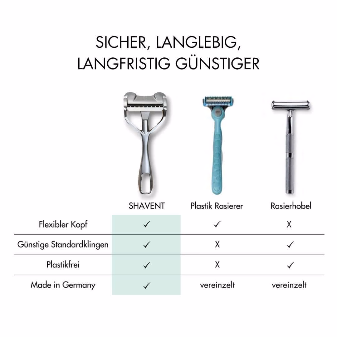 Met het kleine broertje van de SHAVENT Original ben je perfect uitgerust voor onder de douche en op reis. Met zijn eenvoudige handgreepontwerp, subtiele matte chroomafwerking en een hoogte van 12 cm is hij de ideale functionele metgezel. De handige uitsparing in het handvat biedt ruimte om hem bijvoorbeeld in de douche op te hangen.