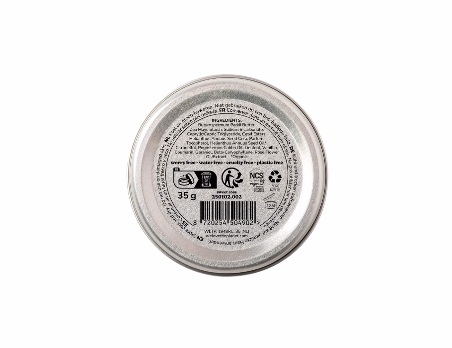 De deodorant van We Love The Planet is 100% natuurlijk en bevat geen onnodige toevoegingen. Er zitten dus geen synthetische of irriterende ingrediënten in, en de deodorant bevat geen aluminium. Hierdoor is de deodorant beter voor jouw huid en onze planeet.
